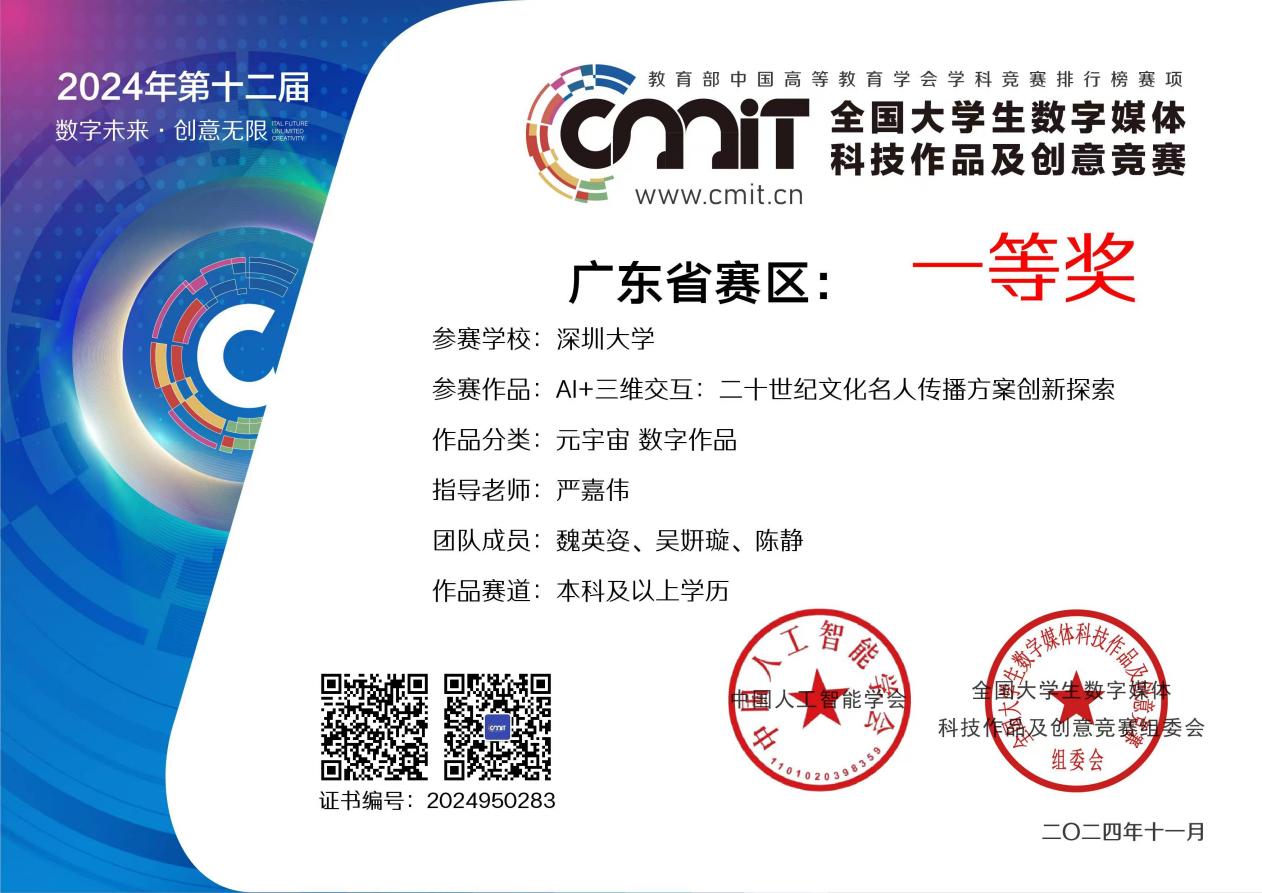2024年11月22日至24日,由“中国人工智能学会”和“全国大学生数字媒体科技作品及创意竞赛组委会”共同主办的2024年第十二届全国大学生数字媒体科技作品及创意竞赛(以下简称:“数媒竞赛”)全国总决赛成绩揭晓,传播学院参赛项目“AI+三维交互:二十世纪文化名人传播方案创新探索”斩获“全国总决赛一等奖”奖项!。